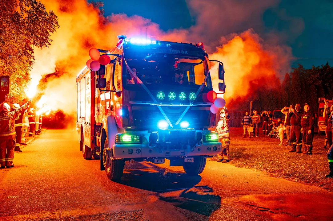 Było to powitanie z honorami! Odpalono race, odpalono fajerwerki, polał się szampan, a na powitanie nowego pojazdu przybyli strażacy z okolicznych jednostek - m.in. z Sikorza, Drobina, Staroźreb, Płocka czy Starej Białej.