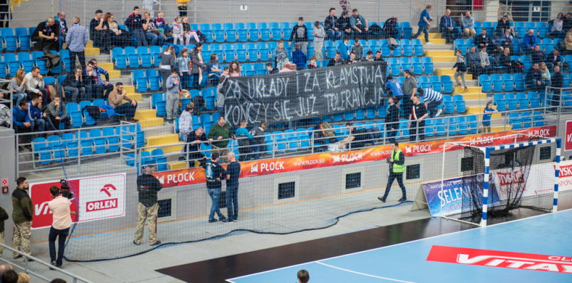 Protest rozpoczął się w drugiej połowie. Grupa ok. 20 kibiców wywiesiła transparent z hasłem "Za układy i za kłamstwa kończy się już tolerancja". Dostało się prezydentowi Andrzejowi Nowakowskiemu i wiceprezesowi Murawskiemu. Trudno jednak powiedzieć, by hala była jednomyślna w ocenie sytuacji. Kiedy grupa siedząca w młynie skandowała swoje hasła, reszta gwizdała.