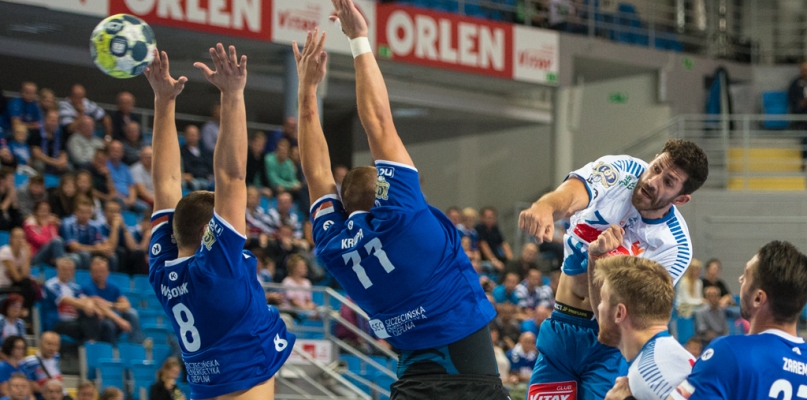W pierwszej połowie środowego spotkania zbyt wielu fajerwerków nie ujrzeliśmy. Już od początku zarysowała się delikatna przewaga graczy Wisły, którzy kontrolowali mecz utrzymując dwie bramki przewagi. Newralgicznym momentem okazała się przerwa dla trenera drużyny gości w 20 minucie, po której Nafciarze powiększyli prowadzenie do czterech bramek. Na przerwę zawodnicy zeszli przy wyniku 16-12. Wynik po ładnym rajdzie ustalił Sime Ivić.