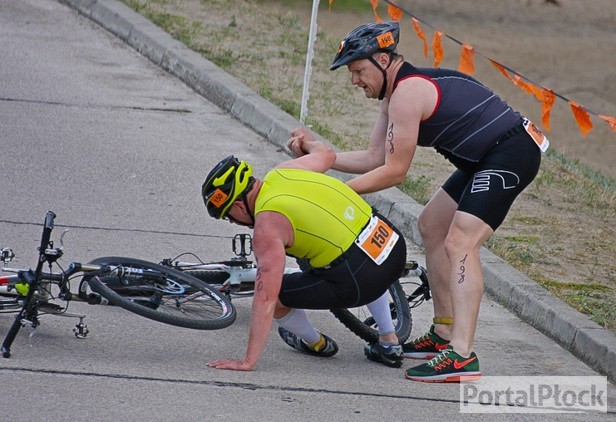 W triathlonie (kolarstwo, pływanie, bieg) wystartowało blisko 130 zawodników. Jak poszło bohaterom naszego zdjęcia? Tomasz Misztela ze Słupna z numerem 150, który się przewrócił, pokonał trasę w 44 minuty 37 sekund, zajmując 58. miejsce w dyscyplinie rowerowej (ogółem zajął 8. miejsce w swojej kategorii wiekowej M4 01:25:40). Z kolei rowerzysta, który mu pomógł, Jarosław Możdżyński z Włocławka z numerem 198, pokonał tę trasę w 44 minuty i... 36 sekund, wyprzedzając swojego rywala o jedno miejsce w wyścigu rowerem, ale w tej samej kategorii wiekowej, zdobywając 10. miejsce z czasem 01:31:19. Obu panom gratulujemy wyników i dziękujemy za budujący obrazek.