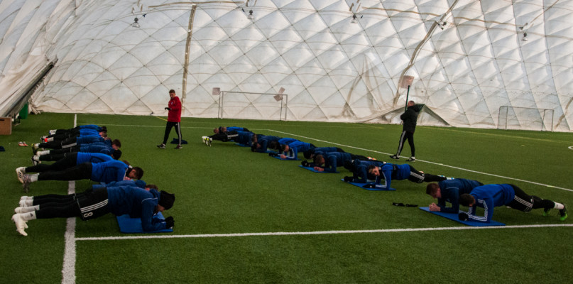 Zaczęło się o 9:30 od krótkiej odprawy. Radosław Sobolewski miał do dyspozycji prawie wszystkich zawodników. Na dłuższe urlopy dostali obcokrajowcy, którzy mają daleko do domu - Giorgi Merebaszwili i Ricardinho. Drobna infekcja wykluczyła Aleksandra Pawlaka, a Maciej Spychała wyjechał na testy do GKS-u Bełchatów. Stawił się za to Dawid Kocyła, nowy zawodnik niebiesko-biało-niebieskich.
