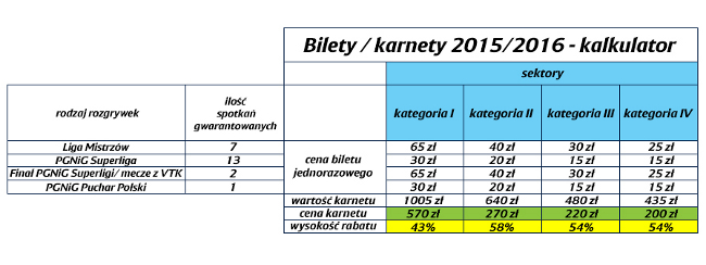 Ceny karnetów na sezon 2015/2016 wachać będą się od 570 zł - karnet kategorii pierwszej, do 200zł - karnet kategorii drugiej. Karnety doładowywać będzie można od poniedziałku do 23 sierpnia, w tym samym okresie odbywać będzie się również sprzedaż nowych kart. Transakcji dokonać będzie można w sklepie Dagna, Sklepie Kibica w Orlen Arenie, sklepie Intersport oraz w siedzibie klubu.