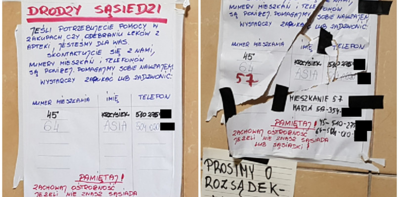Na naszą skrzynkę dotarło zdjęcie od czytelnika, który w swoim bloku natknął się na swoistą propozycję pomocy ze strony sąsiadów. Pani Joanna i pan Krzysztof zaoferowali swoim sąsiadom, że chętnie zrobią za nich zakupy - czy to spożywcze czy w aptece. Dodali też, że warto korzystać z takiej pomocy, o ile znamy swoich sąsiadów.