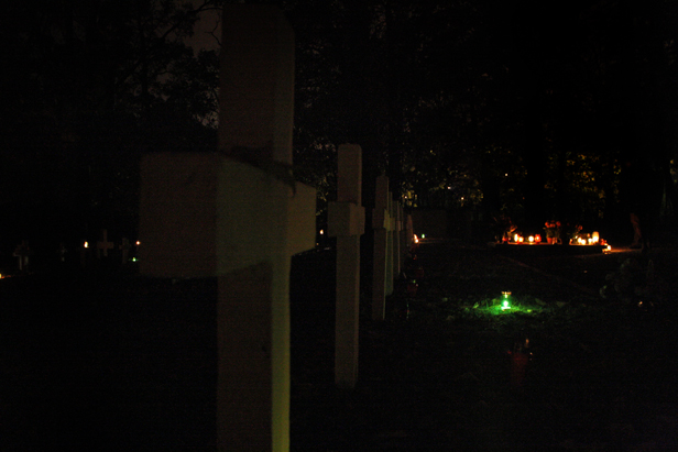 Na zdjęciach: Wszystkich Świętych 2012 - pogrążony w nieprzeniknionych ciemnościach cmentarz garnizonowy i oświetlony zniczami cmentarz prawosławny