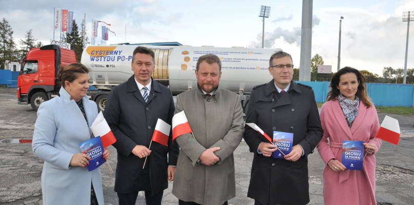 Kandydaci Prawa i Sprawiedliwości ustawili przed stadionem Wisły Płock cysternę wstydu i wyliczali, że na nielegalnym obrocie paliwem budżet tracił ponad 160 mln złotych tygodniowo. Odnieśli się też do protestu grup medycznych, podziału Mazowsza i obniżki podatku VAT.