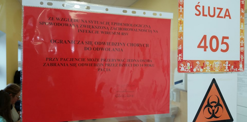 Miesiąc temu na drzwiach wejściowych przynajmniej dwóch oddziałów - onkologicznego i dziecięcego - umieszczono kartkę z ostrzeżeniem. Na oddziałach panowała epidemia wirusa RSV, przez co ograniczono odwiedziny u chorych, a dzieci młodsze niż 14 lat w ogóle nie mogły wejść na oddział.