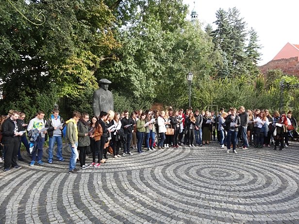W środę o godzinie 15.30 na starówce zgromadziła się spora ilość gimnazjalistów i uczniów szkół średnich wyposażonych w kartki. Na miejscu przywitała ich dyrektorka Książnicy Płockiej Joanna Banasiak, po czym rozpoczęło się wspólne czytanie. Skoro jednak mieszkamy w Płocku, z którego pochodził Władysław Broniewski, to czemu nie skorzystać właśnie z jego bogatej twórczości? W ten sposób przechodnie posłuchali fragmentów „Słońca września” i „Nic więcej”, najpierw pod ratuszem, później na skwerze przy pomniku Bolesława Krzywoustego. Szło błyskawicznie. W sumie cała zabawa nie potrwała dłużej niż 30, 40 minut. Uczniowie udali się jeszcze skwer przy pomniku Ludwika Krzywickiego, gdzie padły fragmenty „Ballady wrześniowej” Jacka Kaczmarskiego, natomiast pod katedrą usłtyszano „Modlitwę” Juliana Tuwima, a na schodach przed kinem na Tumskiej „Śpiew dla ojczyzny” Tadeusza Kubiaka.