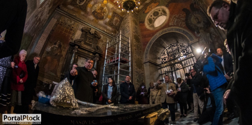 Szczątki z początku mogły zostać pochowane w zupełnie innej części katedry. Wiadomo, że to biskup Andrzej Noskowski nakazał kości wydobyć w XVI wieku i pochować je w trumnie przy wejściu do prezbiterium. Zapewne leżałyby tak dalej, gdyby nie biskup i pierwszy prezes Towarzystwa Naukowego Płockiego, Adam Prażmowski, który postanowił historycznych władców bardziej uhonorować, wystawiając im pomnik w północnej wieży. W ten oto sposób, 22 lipca 1825 roku, po całodziennym kopaniu, odkryto pieczarę w samym środku prezbiterium. W środku znaleziono drewnianą, zbutwiałą już skrzynię, po bokach spojoną żelaznymi klamrami. W środku było pięć czaszek i około 30 kości długich. - Nie znaleziono insygniów władzy, ani kosztowności - kontynuował ks. Grzybowski. Piastowie doczekali się ponownego pogrzebu 12 września 1825 roku. Kości złożono do podziemi kaplicy w północnej wieży. Do środka włożono coś jeszcze, szklaną butlę skrywającą zwój pergaminu. Odtąd w kaplicy stanął również dobrze znany płocczanom, aczkolwiek pusty w środku, symboliczny sarkofag, a samo miejsce nazwano Kaplicą Królewską.
