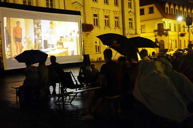 W części starówki przeznaczonej na nocny seans latarnie okryto materiałem, dostawiono we wtorek ławki i leżaki. Gdyby nie deszcz, który co chwila to zaczynał padać, to przestawał, by za chwilę znów pokropić, byłoby to całkiem przyjemnie zorganizowane letnie kino pod chmurką. Ale do czego w końcu służą parasole i peleryny przeciwdeszczowe, jak nie do osłonięcia siebie i bliskiej nam osoby w razie deszczowej aury. Kino letnie najwyraźniej chwyciło. Miejsca siedzące były pozajmowane, niektórzy sobie stali, inni siedzieli z boku.