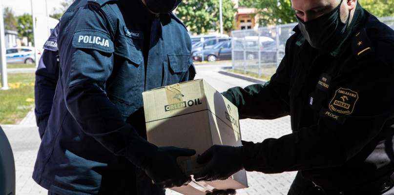 PKN ORLEN sukcesywnie przekazuje darowizny płockim instytucjom - ratuszowi, pogotowiu, szpitalowi. Kolejna partia pomocy dotarła do Komendy Miejskiej Policji w Płocku.