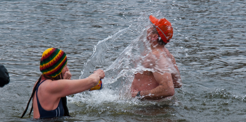 - Woda była mokra... - opowiada z przejęciem respondent Emil - zostałem poinformowany na wstępie. Dorośli ludzie bawili się jak dzieci, pluskając się wodą w wodzie. Z brzegu wszystko obserwował kurczak, który oficjalnie był kaczką. Panował świetny, świąteczny nastrój. Aura pogodowa trochę zbyt ciepła, ale kąpiel przyjemna. Też omal nie zostałem oblany, ale udało się wyjść suchą stopą. Łabędzie przyglądały się z zainteresowaniem, ale gdy nie dostały nic do jedzenia, popłynęły w swoją stronę.