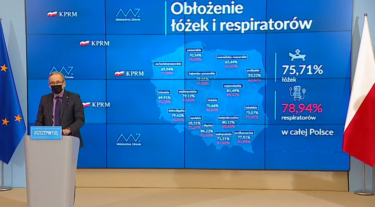 W chwili trwania konferencji zajęte były 33 906 łóżka covidowe, a teoretycznie do walki z covidem przeznaczonych jest 46 tys. łóżek. Zajętych respiratorów było 3 457, a dostępnych łóżek respiratorowych jest ok. 4,5 tys. Minister podkreślał, że istnieje bufor bezpieczeństwa.