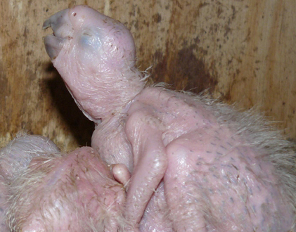 Na razie trudno piać z zachwytu - maluszki są ślepe, łysawe, tylko z lichym irokezem i nic nie zdradza kolorowego upierzenia, którym niedługo się pokryją. Ale łyse golaski za ok. 2,5 miesiąca będą cieszyć oko publiczności w swojej wolierze w pawilonie ptaszarni.