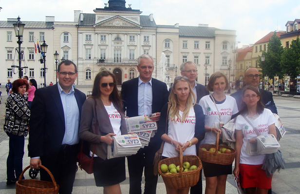 Politycy partii Jarosława Gowina na czele z nim samym, a także z Pawłem Kolczyńskim, Markiem Czarneckim i Marcinem Flakiewiczem w niedzielne popołudnie rozmawiali z płocczanami, rozdawali gazetki oraz - a jakże - częstowali płocczan jabłkami. - To najuczciwsza forma kampanii wyborczej, a nie zabilbordowanie całej Polski za pieniądze podatników - mówił Jarosław Gowin. Odniósł się też do spotu promującego 10-lecie Polski w Unii Europejskiej. Oczywiście, było dużo korzyści, ale dokonując podsumowania nie można nie wspomnieć choćby o 3 mln Polaków, którzy wyemigrowali, bezrobocie jest cały czas wysokie, a zarobki Polaków znacznie mniej niż obywatele innych państw Unii. Po to powstała Polska Razem, by to zmienić - mówił.