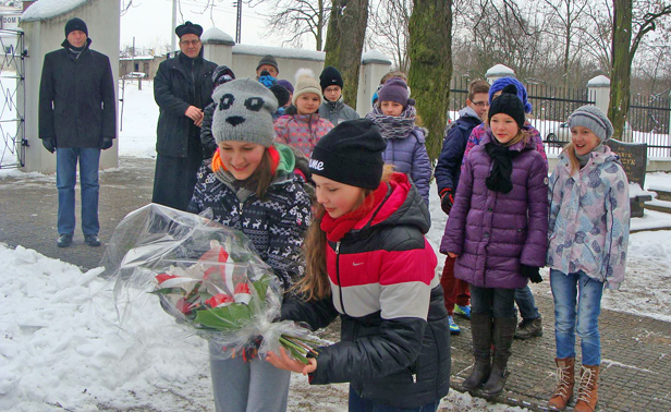 Mimo mrozu i paskudnej pogody grupka piątoklasistów z nauczycielem wybrała się na cmentarz garnizonowy, którym szkoła się opiekuje, by złożyć kwiaty na grobie powstańców. Razem z proboszczem katedry ks. kan. Stefanem Cegłowskim, a także radnym Leszkiem Brzeskim odmówili też modlitwę w intencji poległych.