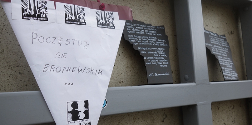 Najwyraźniej krata przy schodach na ul. Mostowej paradoksalnie nie stała się miejscem dla roślin, tylko co pewien czas służy do urządzania galerii wplecionej w miejską przestrzeń. Miniaturowe pomniki Broniewskiego są do wzięcia za darmo, na każdym umieszczono inny wiersz poety. Może dzięki tej akcji niektórzy przypomną sobie o jego twórczości, tak jak zrobili to kilka lat temu artyści na czele z Muńkiem Staszczykiem z T'Love, Pidżamą Porno, Zespołem Pustki, Marcinem Świetlickim. "Poczęstujecie się" Broniewskim? Jeśli macie ochotę, to nie zwlekajcie, kilka pomników już zniknęło.