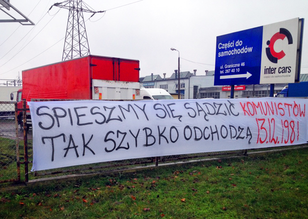„Śpieszmy się sądzić komunistów, tak szybko odchodzą” - parafrazą znanego wiersza ks. Jana Twardowskiego ktoś chciał przypomnieć o wydarzeniach z grudnia 1981 r. Aby nie było wątpliwości, o które wydarzenia z najnowszej historii Polski chodzi autorom hasła, obok napisano na czerwono datę 13 grudnia 1981 r.