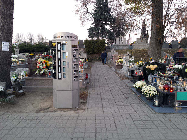 W jednej z alejek na cmentarzu w Proboszczewicach niedaleko Płocka stanął automat ze zniczami i wkładami.
