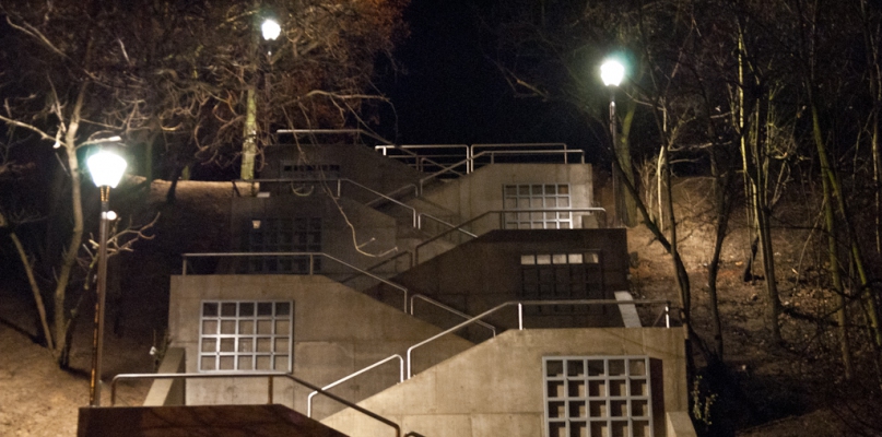 Nowe schody, przypominające swoim kształtem stare, wykonano z betonu zbrojonego stalą żebrowaną. Dodano poręcze i podświetlenie typu LED. Docelowo ściany będą okryte bluszczem pospolitym rozpiętym na kratach, ale to nastąpi dopiero, kiedy już zima nas na dobre raczy opuścić w przyszłym roku.