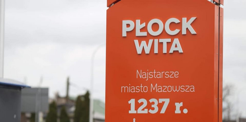 „Płock wita" lub "Płock zaprasza ponownie", a dalej napis "Najstarsze miasto Mazowsza 1237 rok”. Pod spodem zarys katedry. Tak wyglądają nowe dwustronne, wysokie na pięć metrów, witacze przy granicach miasta. Trwa montaż.