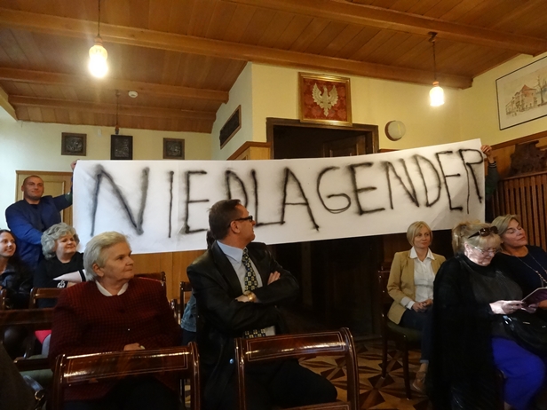 Ledwie zdążyła poruszyć zagadnienie gender, kiedy dwóch młodych mężczyzn z falangą na rękawach weszło do sali. Rozciągnęli transparent na samym końcu pomieszczenia, czym mocno utrudnili możliwość wejścia i wyjścia.