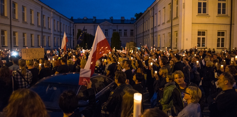 - Hańba – krzyczeli płocczanie. Później skandowano „Lech Wałęsa”, „Solidarność”, „Wolna Polska europejska”, wspomniano też o pewnym anonimie dotyczącym wywieszonej flagi na znak solidarności z protestującymi. Ktoś uznał, że doszło do „profanacji flagi” i liczy, że „zajmą się tym odpowiednie władze”. Inna osoba miała nadzieję, że „nie umrze w dyktaturze faszystowskiej”. Zwracano uwagę na „bubel prawny”, ponieważ do Senatu skierowano ustawę o Sądzie Najwyższym w innej wersji niż rozpatrywali posłowie.