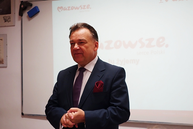 Co jeszcze? Gospodarka. - Co drugie jabłko i co czwarta truskawka w Polsce wyrasta na Mazowszu, w części południowej zdecydowano się na paprykę – omawiał kwestie związane z rolnictwem. Wspomniał o ogromnym znaczeniu dla regionu przemysłu petrochemicznego. Obecnie w całym regionie funkcjonuje 742 tys. firm, przy czym 33 tys. z kapitałem zagranicznym. Porównywał poszczególne województwa z innymi państwami Europy. Mazowsze (z PKB wynoszącym 116,4 mld USD, czyli 419 mld zł) zestawił z Ukrainą. Na drugim miejscu znalazło się województwo śląskie. Dalej zadbał o „krótki kurs z administracji samorządowej”, aby uczniowie rozróżniali poszczególne urzędy, wiedzieli ile w województwie jest szpitali, dróg, obiektów sportowych czy instytucji kultury. W dodatku okazało się, że więcej młodych ludzi było na lotnisku w Modlinie niż korzystało z usług Kolei Mazowieckich, które za kilka dni wzbogacą się o sześć nowych pociągów.