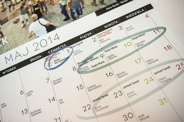 W zamówionych przez Urząd Miasta kalendarzach ważniejsze imprezy miejskie zakreślono na kolorowo, by nie umknęły uwadze właścicieli kalendarzy. Jak już pisaliśmy, zaznaczono m.in. Piknik Lotniczy, Jarmark Tumski, główne festiwale, czyli Audioriver, Reggaeland, Summer Fall Festival itd.