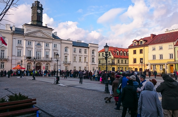 Dziś owocowa akcja miała swą premierę na starówce. Wiadomość przekazywana z ust do ust dotarła chyba do wielu osób, bo całe tłumy przyszły przed ratusz po darmowe jabłka. By się rozgrzali w długim ogonku kolejki, częstowano ich kompotem, oczywiście z jabłek.
