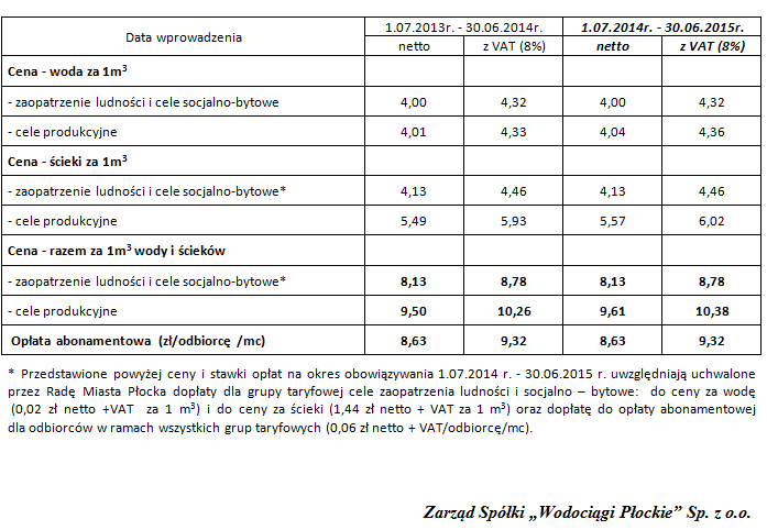 „Wodociągi Płockie” Sp. z o.o. informuje swoich Klientów, że zgodnie z uchwałą Rady Miasta Płocka nr 816/XLVIII/2014 z dnia 27 maja 2014 r. w sprawie zatwierdzenia taryf za zbiorowe zaopatrzenie w wodę i zbiorowe odprowadzanie ścieków w okresie od 01 lipca 2014 roku do 30 czerwca 2015 roku, na terenie gminy Płock, będą obowiązywały taryfy w następującej wysokości: