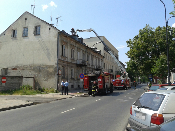 Płomienie pojawiły się na krytym drewnem i blachą dachu kamienicy ok. 13.00. Straż pożarną wezwali pracownicy remontujący kamienicę przy Sienkiewicza. - Na miejsce zostały skierowane trzy zastępy Państwowej Straży Pożarnej i podnośnik - mówi rzecznik strażaków, Edward Mysera. - Budynek jest wyłączony z użytkowania, ale na wszelki wypadek strażacy dokładnie przeszukali kamienicę, czy na pewno nikogo w niej nie ma. Na razie nie wiadomo, co było przyczyną pożaru.