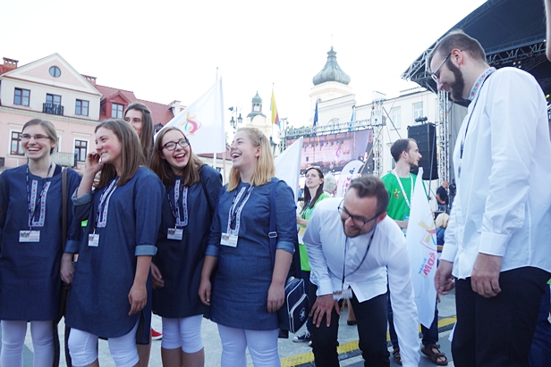 Oczywiście nie zabrakło odegranego hejnału Płocka, występu Zespołu Pieśni i Tańca Wisła i wspólnego odśpiewania hymnu ŚDM. Zabrzmiał aż w siedmiu wersjach za sprawą grup z Polski, Włoch, Francji, Ukrainy, Irlandii, Singapuru i z Armenii. Flagi uniosły się wysoko do góry. - Chcemy po prostu śpiewać, modlić się i wspólnie radować – dodawał koordynator ŚDM w diecezji płockiej, ks. Rafał Grzelczyk. Francji nawet podziękował za Euro 2016. Najbardziej radośnie na wszystko, co się działo na starówce, reagowali Włosi, którzy stanęli niemal przy samej scenie.