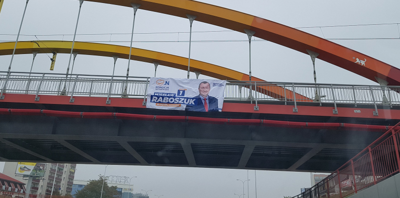 Nad wiaduktem zawisł plakat Wiesława Raboszuka, kandydata Koalicji Obywatelskiej do sejmiku wojewódzkiego. Ratusz zapewnia, że nie pozwala na takie praktyki.
