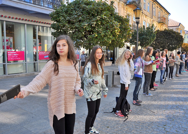Dzieci ustawiły się jedno koło drugiego. Między nimi stanął wiceprezydent Roman Siemiątkowski. Mali pomocnicy nie potrzebowali nawet nauczycieli - sami się instruowali: - Przesuwamy się przesuwamy - upominali się nawzajem.