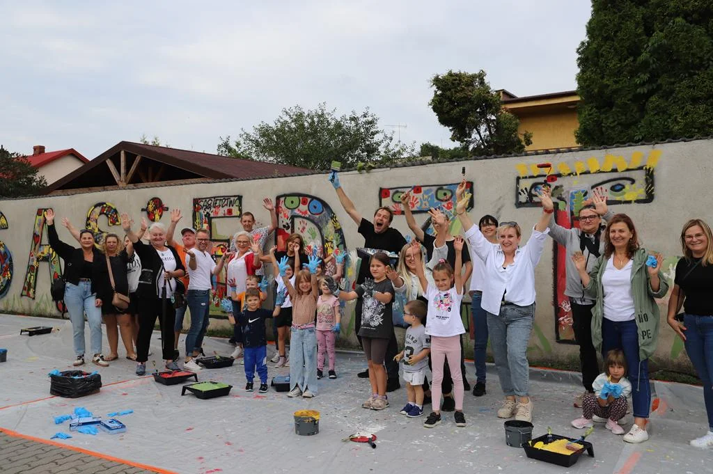 Mieszkańcy płockich Borowiczek oraz podopieczni Teatru Per Se swój performens rozpoczęli od wykonania kolorowego muralu przy Szkole Podstawowej nr 20.