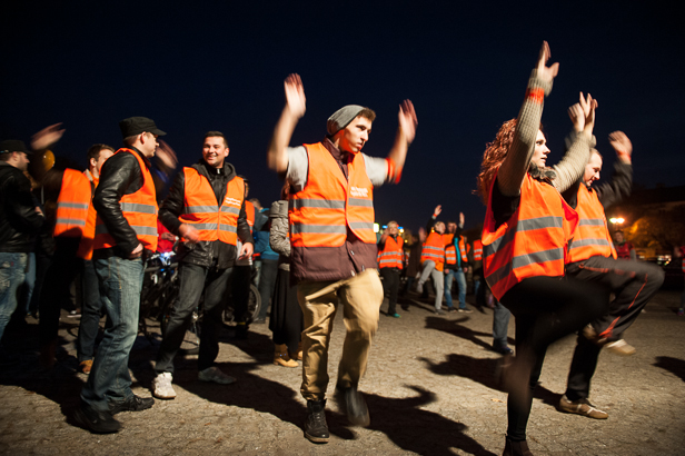 Miejsce zbiórki wyznaczono na plac przed teatrem. Przed 17.00, gdy już zaczął zapadać zmrok, zaczęło się tam schodzić dziesiątki osób. W końcu grubo ponad 200 osób ubranych w pomarańczowe odblaskowe kamizelki z napisem „Moim zdaniem Andrzej Nowakowski” przemaszerowało (albo przejechało na rowerach) sprzed teatru przez Tumską na Stary Rynek. Tam była grochówka i wspólne tańczenie zumby.