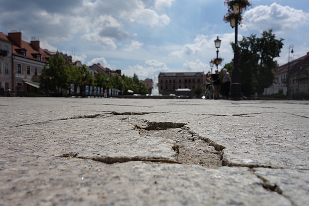 Rok temu pytaliśmy o popękane płyty na starówce. Dokładnie w czasie, kiedy usypano przed ratuszem wielką plażę na mistrzostwa Polski w piłce ręcznej plażowej. Chcieliśmy wiedzieć, czy piach nie pogorszy ich stanu. Ratusz informował, że płyty już były wcześniej uszkodzone, a koszty położenia nowych to około miliona złotych. Kwota, jak utrzymywali urzędnicy, duża, więc nikt się nie spieszył do umieszczenia takiego zadania w miejskim budżecie.