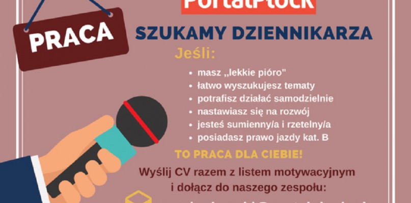 CV wraz z listem motywacyjnym prosimy wysyłać na: m.wisniewski@portalplock.pl. Uprzejmie informujemy, że skontaktujemy się tylko z wybranymi kandydatami. Na zgłoszenia czekamy do 22 czerwca.