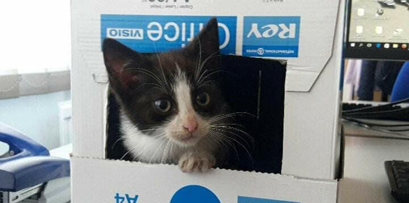 Kotek znajduje się w biurze, dlatego sprawa jest bardzo pilna. Może tam zostać jeszcze tylko przez kilka godzin, ponieważ przebywa tam tylko dlatego, że pracownicy uzyskali zgodę od swojego szefa. Był tak przemarznięty, że zasnął przy kaloryferze. To prawdopodobnie kotka. Ma lekko dłuższą sierść, zapowiada się na prawdziwą piękność!