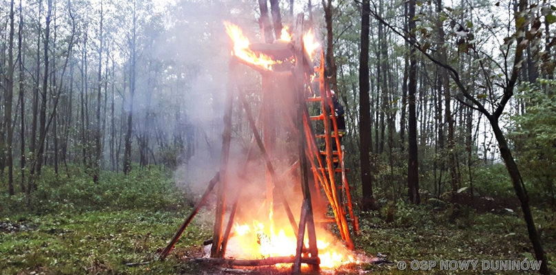 Zgłoszenie o pożarze w lesie w Karolewie (gmina Nowy Duninów) strażacy otrzymali przed 8.00 w piątek. Jak relacjonuje druh Adrian Rozwora, paliła się leśna ambona, czyli drewniana wieżyczka służąca do obserwacji zwierzyny. Poza strażakami z OSP w akcji gaśniczej brali też udział ratownicy z Państwowej Straży Pożarnej.