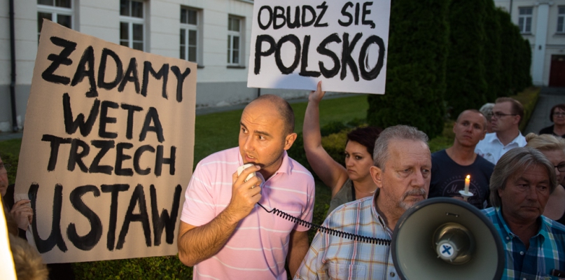 Przed gmachem Sądu Okręgowego i Sądu Rejonowego przy placu Narutowicza ponownie zebrali się przeciwnicy planowanych przez partię rządzącą zmian w sądownictwie. Tym razem "łańcuch światła" utworzyła liczniejsza grupa płocczan - około 200 osób z transparentami, a na nich hasła "Chcemy weta" i "Obudź się Polsko".