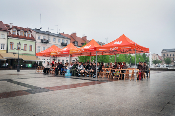 Gdy przed świętami miasto i płocka Kuria zapowiedziały, że kanonizację Jana Pawła II i Jana XXIII będzie można oglądać na telebimie przed ratuszem, za oknem była cudowna pogoda i wydawało się to wspaniałym pomysłem. Ale dziś od rana, gdy zastaliśmy niebo kompletnie zasnute szaroburymi chmurami i siąpiący z uporem maniaka deszcz, wiadomo było, że tłumów na starówce raczej nie będzie.
