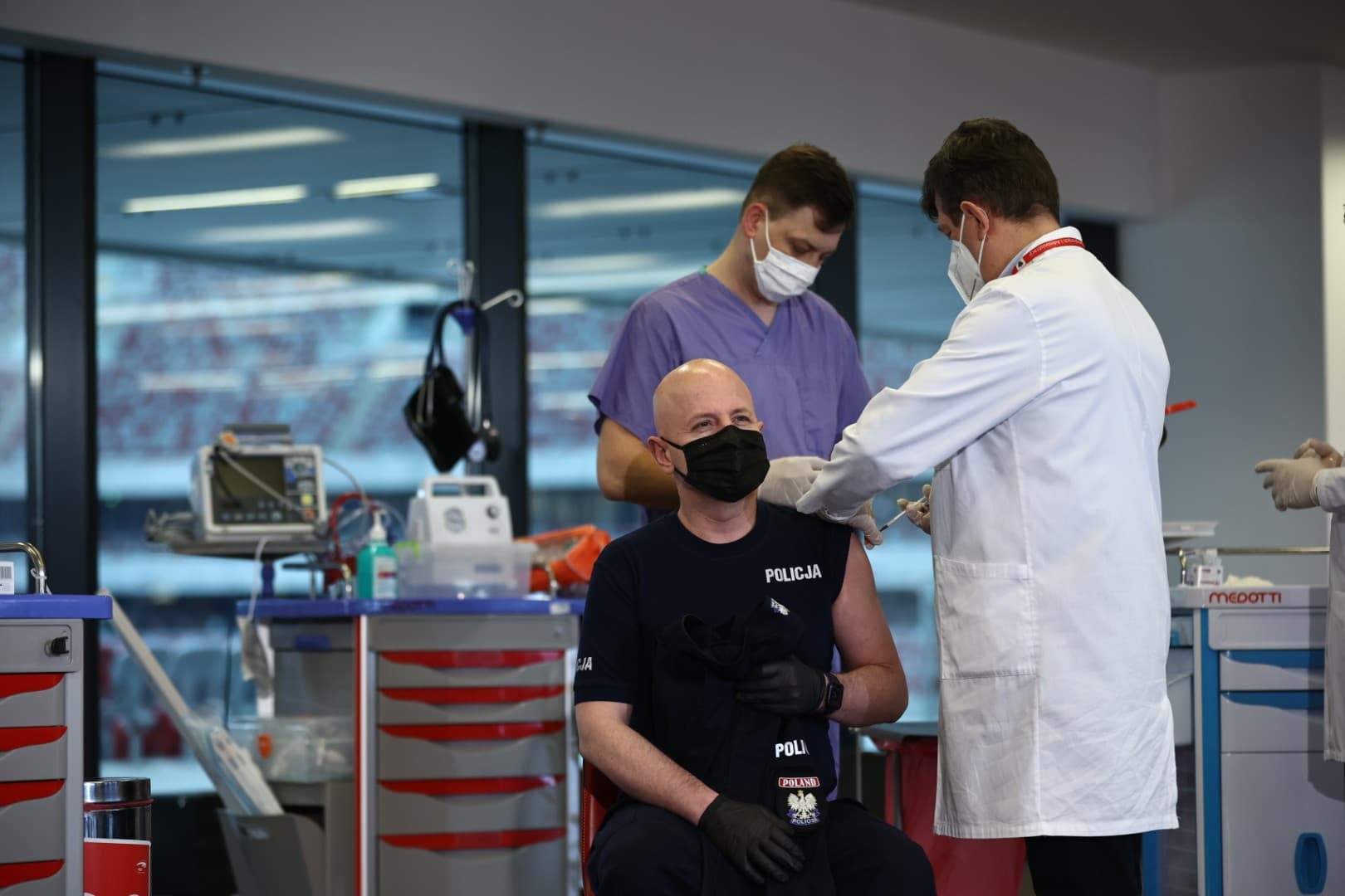 WiadomościDziś w szpitalu tymczasowym na PGE Narodowym zainaugurowane zostały szczepienia służb mundurowych; jako pierwszy szczepionkę przyjął Komendant Główny Policji gen. insp. Jarosław Szymczyk oraz komendanci lub zastępcy komendantów pozostałych służb podległych MSWiA oraz Służby Więziennej.
