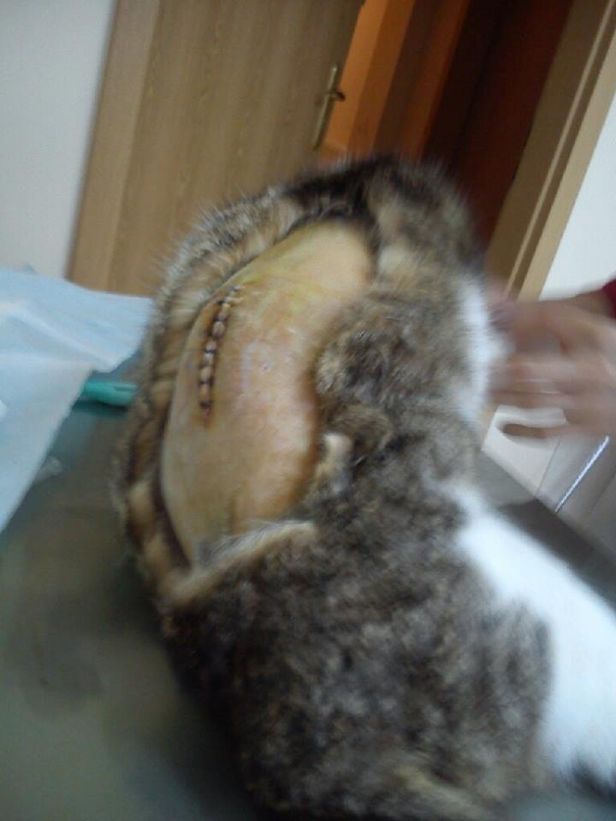 Początkowo wydawało się, że uraz mógł być spowodowany wypadkiem drogowym. Ale zdjęcia rtg wykazały, że kotka została postrzelona, a śrut utkwił centralnie w kręgosłupie. I to właśnie stało się źródłem porażenia.