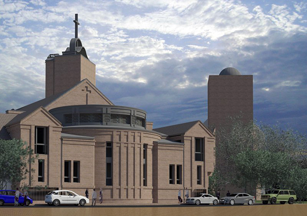 Fot. wizualizacja Sanktuarium Bożego Miłosierdzia, widok od Piekarskiej, mniej więcej z miejsca, w którym ustawiono pomnik Bolesława Krzywoustego; architekt Jacek Jaśkowiec źródło plock.faustyna.pl