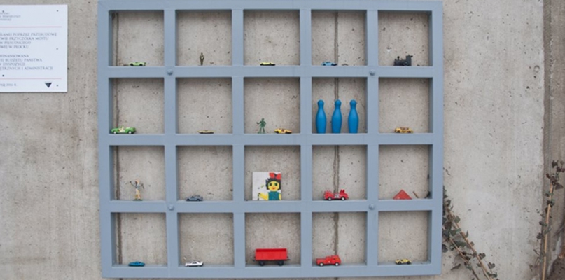 Kręgle, resoraki, małe żołnierzyki, ciuchcia, układanka, wagoniki. Bynajmniej nie chodzi o sklep z zabawkami, tylko o miejsce niedaleko mostu im. Legionów Piłsudskiego. Ktoś je potraktował z poczuciem humoru.