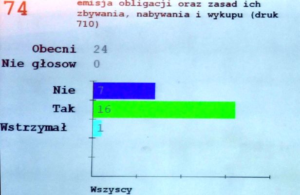 Wynik głosowania był w tej sytuacji dość łatwy do przewidzenia. Za przyjęciem uchwały o wyemitowaniu obligacji miejskich głosowało 16 radnych: Grażyna Cieślik, Marcin Flakiewicz, Wojciech Hetkowski, Artur Jaroszewski, Jacek Jasion, Paweł Kolczyński, Artur Kras, Piotr Kubera, Lech Latarski, Magdalena Lewandowska, Grzegorz Lewicki, Tomasz Maliszewski, Aniela Niedzielak, Piotr Nowicki, Joanna Olejnik i Maciej Wiącek.