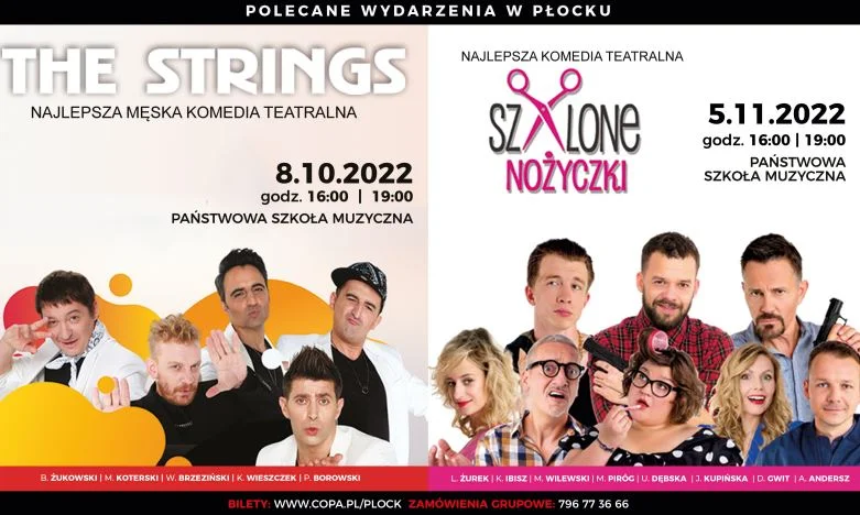 Pierwszy spektakl zaplanowano w płockiej Szkole Muzycznej. To w sali PSM wystawiony zostanie przezabawny spektakl komediowy o przyjaźni, życiowych zakrętach i miłości do… muzyki. „The Strings” opowiada o grupie 5 mężczyzn, którzy spotkali się na życiowym zakręcie. Będą niebanalne żarty, moc przyjaźni i muzyka, która osładza ich perypetie.