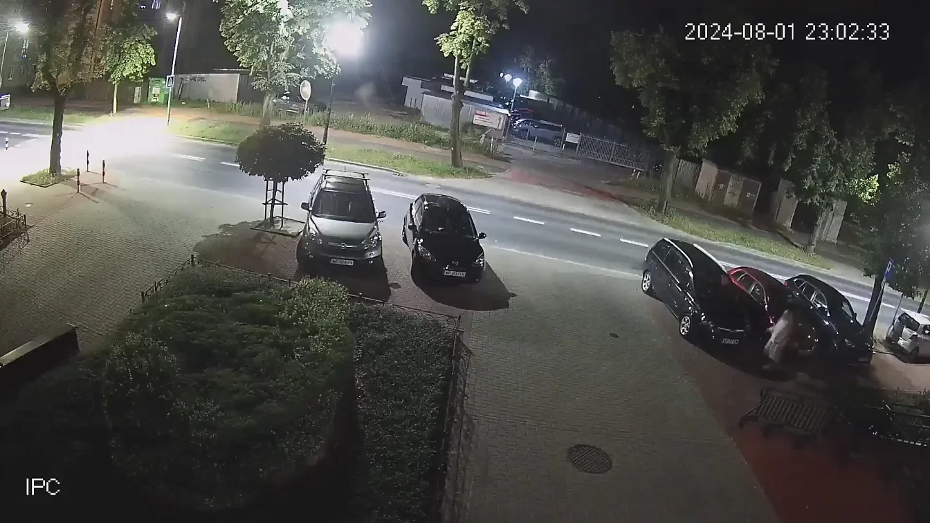 Na krótkim nagraniu udostepnionym przez Komendę Miejską Policji w Płocku widać, jak kobieta spaceruje ulicą Kazimierza Wielkiego, zatrzymuje się przy masce każdego samochodu i go rysuje, prawdopodobnie jakimś niewielkim metalowym przedmiotem.