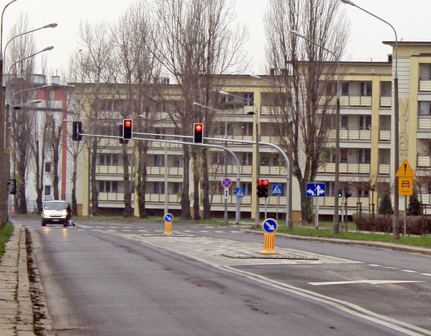 Wracamy na chwilę na Podolszyce. Mijając skrzyżowanie z Patriotów, przed rondem im. rotmistrza Witolda Pileckiego, litościwie przepuszczamy objuczoną siatami starszą panią, która utknęła na środku przejścia dla pieszych i za Chiny nie może przejść. Dojeżdżamy do skrzyżowania, chcemy skręcić w Walecznych. Tam - a jakże - stoimy na czerwonym! Zapala się zielone dla jadących prosto, dla nas wciąż czerwone. Troszkę cofamy, moszcząc się na lewym pasie, by detektory wykryły naszą obecność. Czas dłuży się i dłuży, kilkoro pieszych zdążyło już przejść, przejechały całe gromady szczęśliwców. Dopiero, gdy za nami zatrzymuje się kolejny samochód, wreszcie zapala się zielone. Uff, trzeba tira, żeby detektory zauważyły, że ktoś chce przejechać!